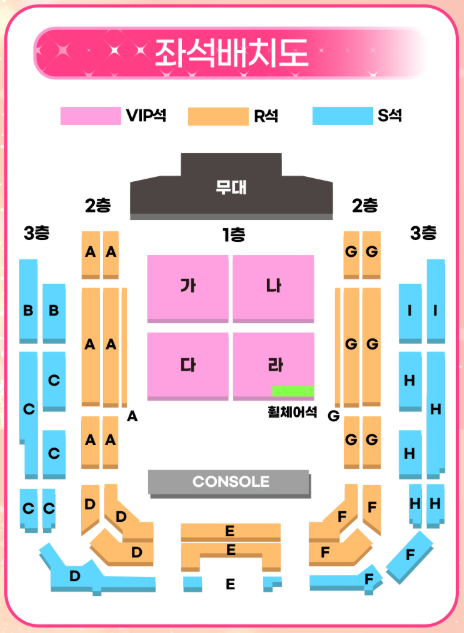 공연장 중앙에 무대가 위치하며, 앞쪽 VIP석부터 시작하여 R석, S석, A석 순으로 좌석이 배치되어 있습니다. 무대 양 옆과 후면은 시야 제한석이 있을 수 있으니 예매 시 참고 바랍니다.